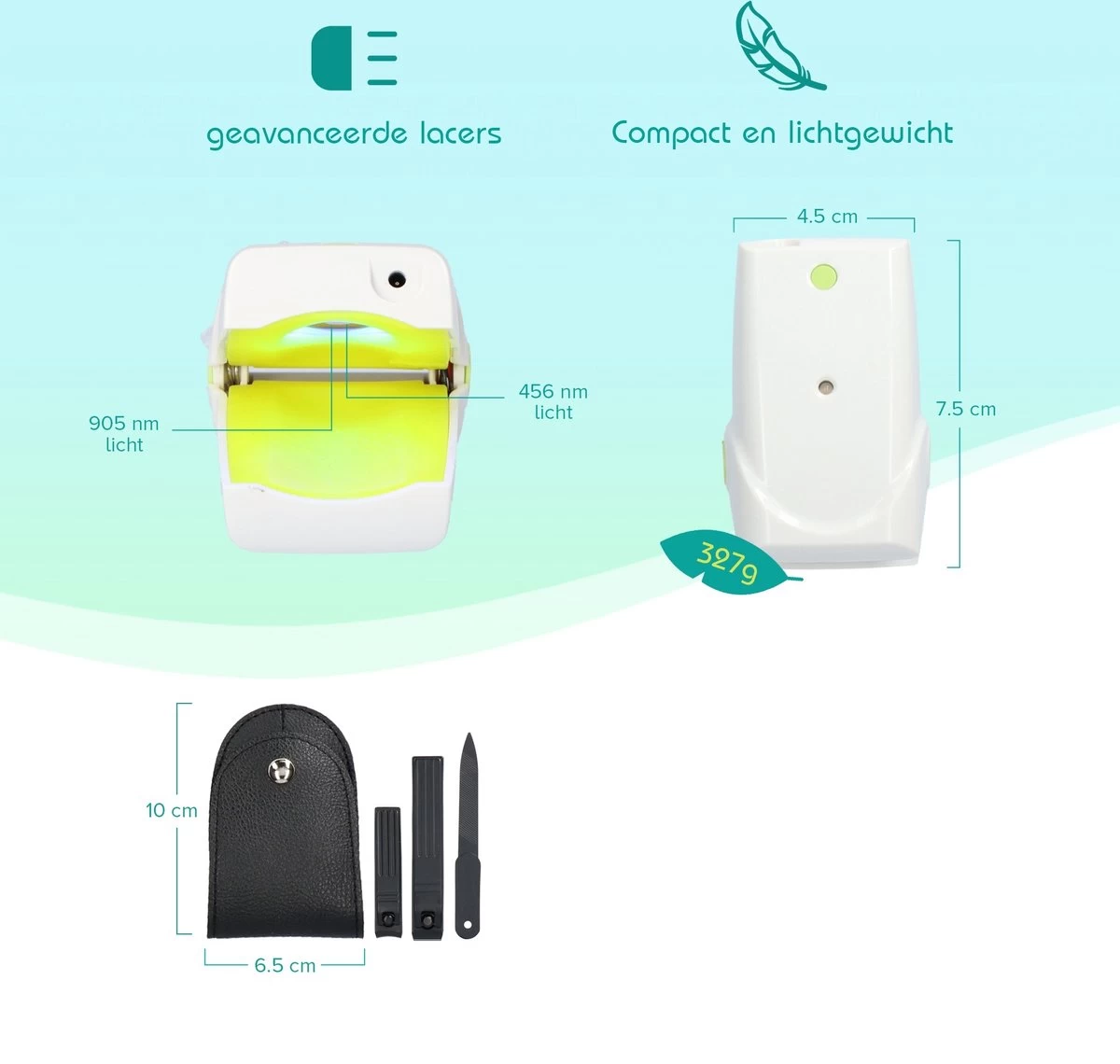 •Het apparaatje is klein en licht van gewicht en daardoor ideaal om mee op reis te nemen. Zo kunt je ten allen tijde de schimmelnagel behandeling voortzetten.