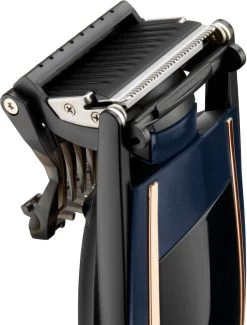 Het mes van deze baardtrimmer mannen is van 100% geslepen RVS messen. Door het slijpen worden de messen scherper en kan er meer vorm aan de messen worden gegeven. Er ontstaat meer dimensie, 3D als het ware. Dit zorgt ervoor dat er meer grip is op de haren. Meer grip en scherper betekent dat je met meer gemak en snelheid je baard kan trimmen.
