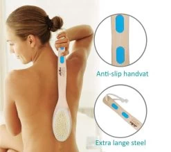 Bent u ook zoek naar een duurzame borstel die zowel uw huid stevig schoon borstelt en deze tegelijktijdig laat stralen? Een schone, stralende maar vooral gezonde huid is dan het resultaat van deze luxueuze bamboe rugborstel van Blubs. De dubbelzijdige kop zorgt met aan een kant voor een zachte en aan de andere kant een harde borstelervaring. Hiermee is de borstel uitermate geschikt voor dry brushen en massage. Tevens zorgt de antistip handvat aan de steel voor een stevig grip.
