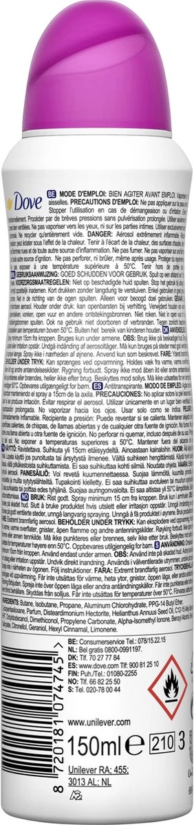 De Dove Go Fresh Anti-transpirant Deodorant Spray Mix is een heerlijke mix voor wie altijd fris wil ruiken. De mix bevat de volgende varianten van Dove Anti-transpirant Sprays: – Dove Go Fresh Passievrucht & Citroengras Anti-transpirant Deodorant – Dove Go Fresh Peer & Aloë Vera Anti-transpirant Deodorant – Dove Go Fresh Acaibes & Waterlelie Anti-transpirant Deodorant – Dove Go Fresh Granaatappel & Citroenverbana Anti-transpirant Deodorant – Dove Go Fresh Komkommer & Groene thee Anti-transpirant Deodorant De anti-transpiranten in deze mix hebben allemaal een andere geur, maar beschermen je allemaal net zo goed tegen zweet en ongewenste geurtjes. Ze zijn verrijkt met 1/4 hydraterende crème met 100% natuurlijke verzorgende olie en helpen om de gevoelige huid te herstellen van irritatie veroorzaakt door het scheren. Dat is optimale verzorging voor je huid en ultieme frisheid. Daar houden we van bij Dove! Of je jezelf nu verrast met deze set deodorants of dat je de set cadeau geeft, met de anti-transpirant van Dove Go Fresh zit je altijd goed. Je ruikt fris, je huid voelt zacht en je kunt vol zelfvertrouwen de deur uitstappen. Dat is nog eens een goed gevoel! Dove biedt naast anti-transpiranten ook deodoranten aan. Beide geven een langdurig fris gevoel en hebben een verzorgende werking voor de kwetsbare okselhuid. Anti-transpiranten bevatten aluminiumzouten die de hoeveelheid zweet verminderen en ervoor zorgen dat je oksels droog blijven, zodat onaangename geurtjes geen kans krijgen. Deodoranten bevatten geen aluminiumzouten, maar wel actieve ingrediënten die ongewenste geurtjes bestrijden. Beide formules zijn vrij van alcohol en verrijkt met de unieke 1/4 hydraterende crème van Dove. Dus welke je ook kiest, je kunt altijd vertrouwen op bescherming, frisheid en heerlijk zachte, gladde en verzorgde oksels. Dove wil bijdragen aan een betere wereld. Om de impact op het mileu te verminderen hebben de Dove anti-transpiranten en deodoranten een andere verpakking gekregen. Onze spuitbussen worden gemaakt van 25% gerecycled en oneindig recyclebaar aluminium, met ecolabel.