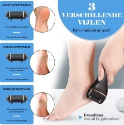 Bij deze elektrische eeltverwijderaar ontvang je een complete voetverzorging set. Je ontvangt 3 opzetstukjes voor een ultiem glad resultaat, begin met de grofste en bouw af naar de zachte vijl. Om alles af te werken zitten er nog drie eeltvijlen, een nagelriem tool en een nagelvijl bij de set.