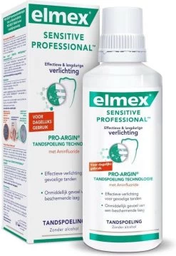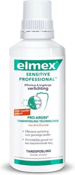 De elmex Mondwater Sensitive Professional, met arginine, zorgt voor een effectieve verlichting voor gevoelige tanden, heeft een milde smaak en brengt een beschermend laagje op de tanden aan. Deze mondwater bevat een exclusieve formule die gebaseerd is op de klinisch bewezen PRO-ARGIN® technologie die tandartsen hun patiënten adviseren om de pijn van gevoelige tanden te verzachten. Het sluit de kanaaltjes af die naar gevoelige tandzenuw leiden, zodat de pijn direct en langdurig wordt gestopt. Deze elmex mondspoeling bevat aminfluoride tegen cariës.