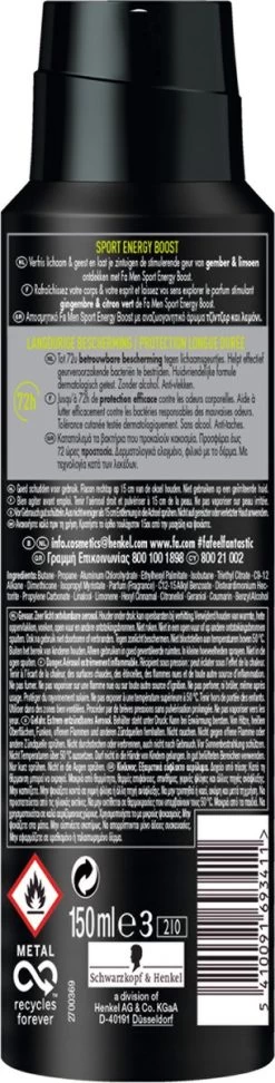 Ontdek Fa Men Sport Energy Boost anti-transpirant spray met de geur van gember & limoen. De vegan formule biedt 72 uur bescherming tegen zweet & nare geurtjes en bevat 0% alcohol.