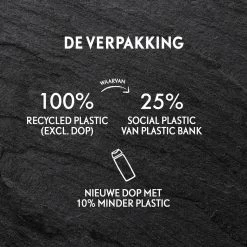 - De verpakking bestaat uit 100% gerecycled plastic (excl. dop), waarvan 25% social plastic