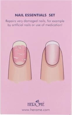 Deze complete set bestaat uit: Herome Exit Damaged Nails (7ml): Herstellende nagelolie met innovatief vitaminecomplex en mineralen dat extreem beschadigde en splijtende nagels direct herstelt.
