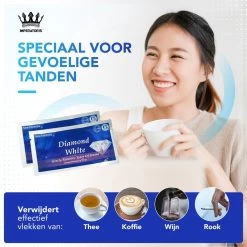 De Diamond White Tandenbleekset is de perfecte keuze voor verkleurde tanden! Onze actieve formule is zonder peroxide en zorgt in slechts enkele eenvoudige stappen voor wel 8 tinten wittere tanden, waardoor uw glimlach weer straalt. Bovendien hoeft u niet langer dure tandartsrekeningen te betalen, want onze tandenbleekset levert vergelijkbare resultaten als professionele behandelingen.