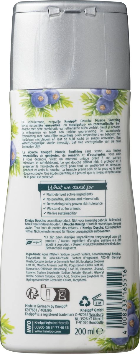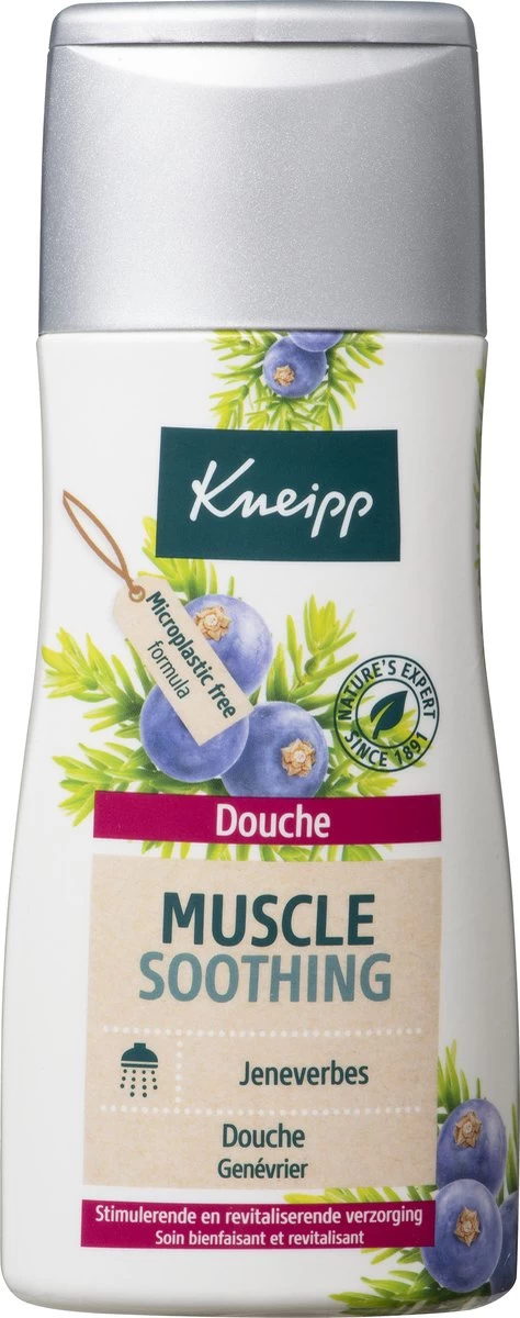 De stimulerende, zeepvrije douchegel Muscle Soothing bevat natuurlijke jeneverbes- en wintergroenolie. Een douche met deze combinatie van etherische oliën verfrist, helpt je lichaam te ontspannen en biedt een unieke geurervaring. De waardevolle milde formulering verbetert het huidgevoel tijdens en na het douchen en zorgt ervoor dat het vochtgehalte** van de huid behouden blijft.