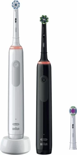 Ervaar de Oral-B Pro 3 van het nummer één meest gebruikte tandborstelmerk door tandartsen wereldwijd. Het slanke handvat van de Pro 3 elektrische tandenborstel helpt je te poetsen zoals uw tandarts dat aanbeveelt: Het helpt je 2 minuten poetsen met de professionele timer en meldt je om de 30 seconden dat je een andere zone moet poetsen. Je beweegt de borstel gewoon in je mond en de unieke, ronde borstelkop van Oral-B doet de rest. Hij verwijdert tot 100% meer tandplak dan een gewone manuele tandenborstel voor gezonder tandvlees en maakt je glimlach witter vanaf de eerste poetsdag door oppervlakkige verkleuringen te verwijderen. Dat is niet alles, de tandenborstel helpt je ook je gevoelige tandvlees te beschermen met de 360 poetsdrukcontrole die de poetssnelheid vermindert en je waarschuwt als je te hard poetst. De Oral-B Pro 3 tandenborstel is onmisbaar voor iedereen die naar een elektrische tandenborstel wil overschakelen en zijn mondgezondheid wil verbeteren.