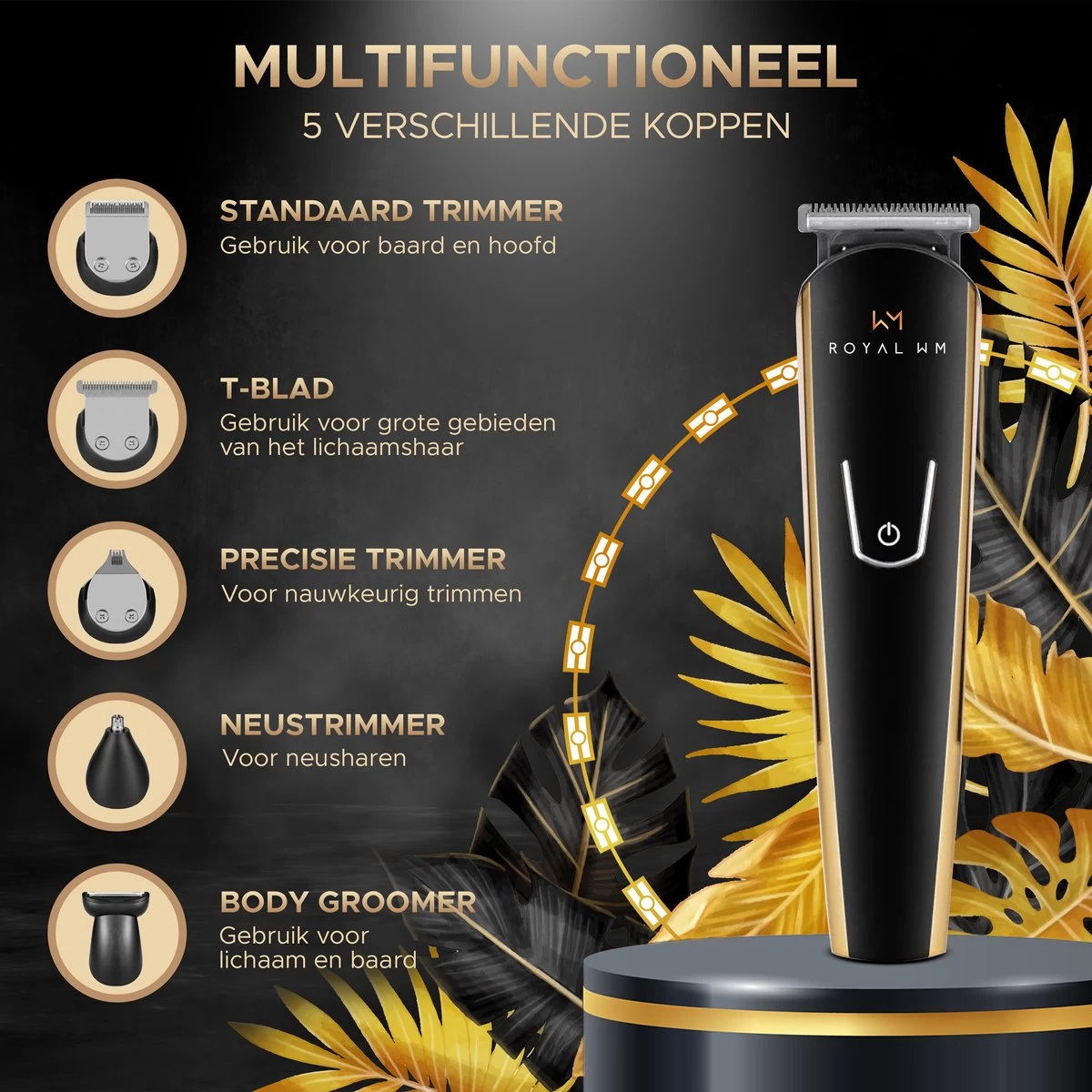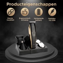 VEELZIJDIG – de haartrimmer is uitgerust met 5 hulpstukken. Inclusief neustrimmer en scheermesje, evenals 5 geleidekammen, oplaadkabel, standaard en smeerolie en reinigingsborstel.